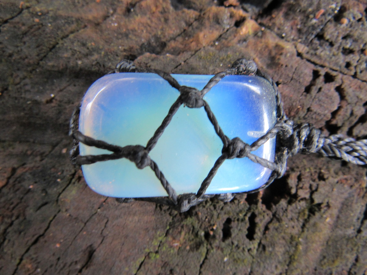 Colar artesanal feito a arte dos nós com pedra da lua, também conhecida por alguns como opalina.