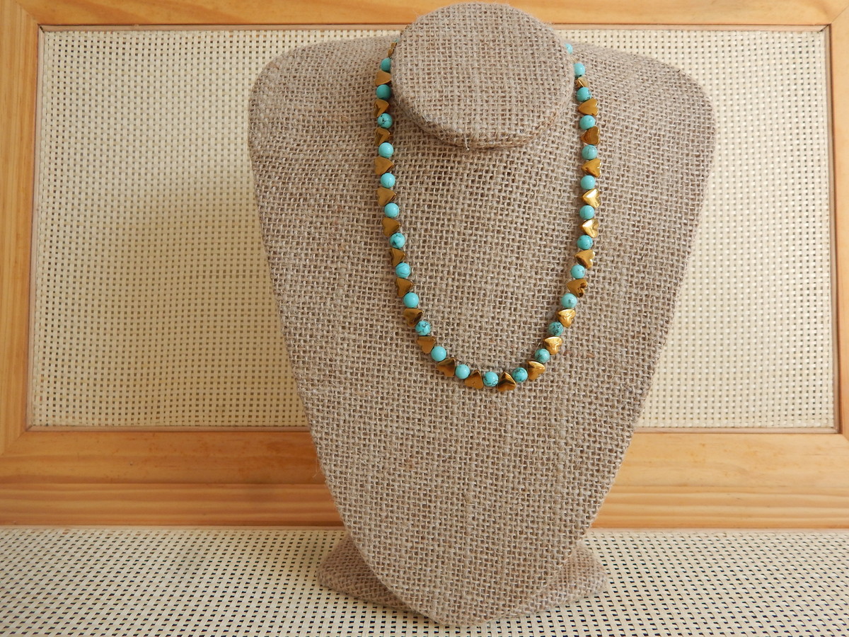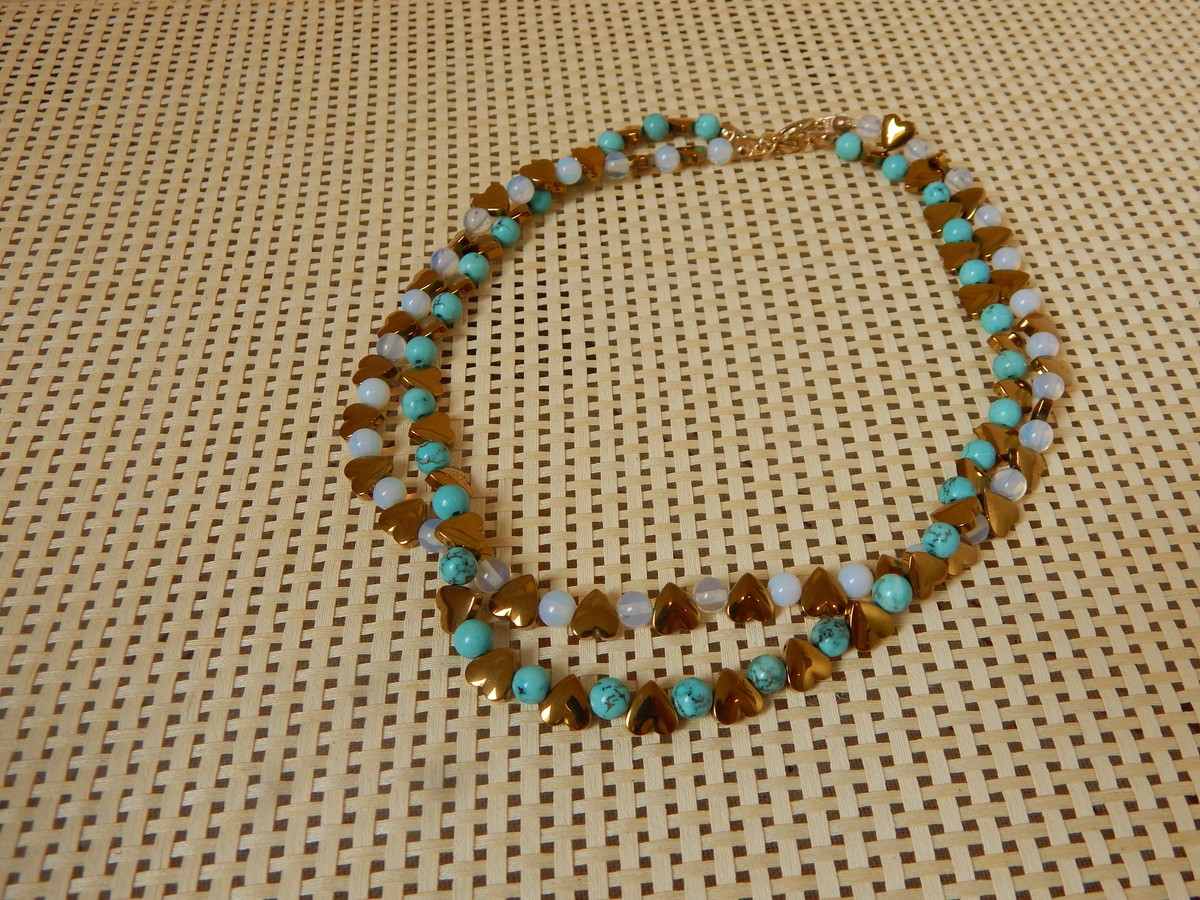 colar de contas naturais de turquesa redonda intercalado com contas de hematitas douradas em formato de coração