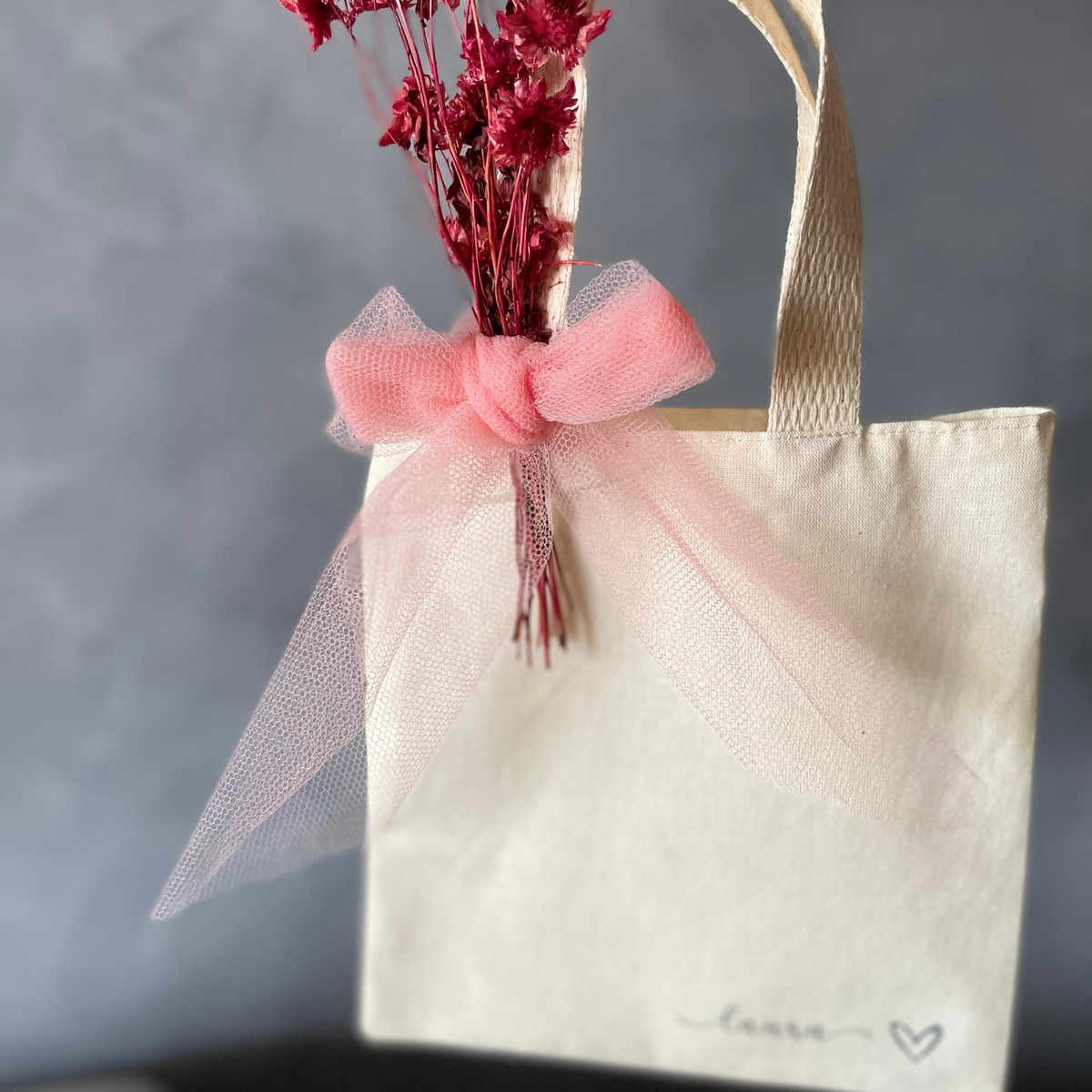 Ecobag 20x20cm com nome, inicias, imagem, logo ou frase (tamanho médio da imagem de 10cm), mini buquê de flores secas e o laço em tule.
