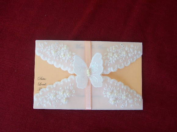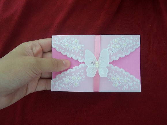 ENVELOPE EM PAPEL VEGETAL COM FITA DE CETIM E ACABAMENTO COM BORBOLETINHA EM PAPEL VEGETAL.