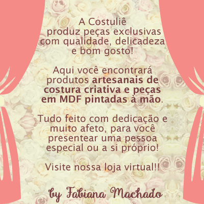 POLÍTICAS DA LOJA - COSTULIÊ COSTURA E PINTURA CRIATIVA: Do prazo de entrega: Sujeito a produção e/ou separação do pedido conforme quantidade. Estes serão realizados somente após a confirmação do pagamento. Da troca: O Cliente poderá reclamar do produto em caso de defeito do mesmo, num prazo de 7 (sete) dias, sendo as custas de envio por conta do Cliente. Do pedido: Os pedidos devem ser concretizados em até 48 horas, após este período será cancelado e cliente deverá realizar novamente o pedido. Do frete: O frete será por Sedex ou PAC conforme escolha do cliente. Frete sempre a cobrar. Da embalagem de presente: Enviamos embalagem de presente quando informado pelo Cliente no momento do pedido, sem custos.
