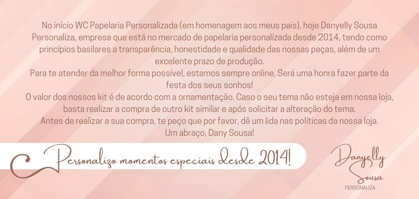 POLÍTICAS DA PERSONALIZA 1. Forma de Pagamento: Escolher uma das opções apresentadas pela plataforma. Em caso de desistência, será reembolsado 50% do valor total, para que seja suprimo os gastos de tempo e material. 2. Prazos para Produção: O prazo total para produção é de 15 dias úteis, começando a conta a partir da confirmação do pedido. Em casos de envio, acrescentar prazo da transportadora escolhida. 3. Criação de Novas Artes: Consultar a disponibilidade do seu tema em nosso portifólio, caso não conste no portifólio, criamos uma nova para você, dentro do prazo de produção, após a confirmação do pedido. Após o envio da arte para aprovação, será dado um prazo de até 05 dias úteis para analise e conferência dos dados como nome, idade e paleta de cores. Não nos responsabilizamos por eventuais erros constatados após a aprovação da arte. São permitidas até 02 alterações na arte. Caso deseje, pode nos enviar inspiração da decoração da festa, mas não fazemos cópias do trabalho de outras colegas. 4. Materiais e Informação sobre as Peças: Produzida em sua maioria em papel cartão offset 180, podendo haver variação no papel, para papéis especiais ou color plus a depender do grau de ornamentação. Evite colocar peso em excesso nas peças, contato com água, poeira, ou exposição ao sol extremo para que não haja danos nas peças. Todas as nossas peças são feitas de modo 100% artesanal. As cores podem sofrer pequenas alterações de cor, visto que, as cores das telas e monitores diferem de marca para marca, assim como, a percepção das cores por cada um de nós. Alguns detalhes podem sofrer pequenas alterações como formato e cor de chaton, tamanho da fita do laço, e etc. a depender da disponibilidade dos nossos fornecedores. Todas as nossas peças são desenvolvidas unicamente para as nossas clientes. Não autorizamos o uso das nossas fotos para uso comercial. Se deseja adquirir algum de nossos arquivos, deve entrar em contato via WhatsApp e solicitar o catálogo de arquivos de corte disponíveis para venda. 5. Formas de Envio: Faça a simulação de envio para saber sobre o preço do frete e prazo de entrega ao clicar em "comprar". Não nos responsabilizamos por atrasos ou avarias na entrega após a postagem nos correios ou transportadora. Fazemos envios internacionais para todo o mundo, solicitar simulação. Aconselhamos que o seu pedido seja feito com antecedência para evitar possíveis transtornos. Todas as nossas peças vão pré-montadas (com exceção de algumas peças que não permite este tipo de envio), apenas para encaixe ou amarração do laço (exceto o Kit Pegue e Monte), para evitar que as peças sejam danificadas no envio e para que o volume de envio seja reduzido.