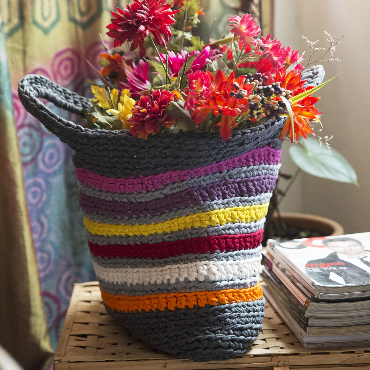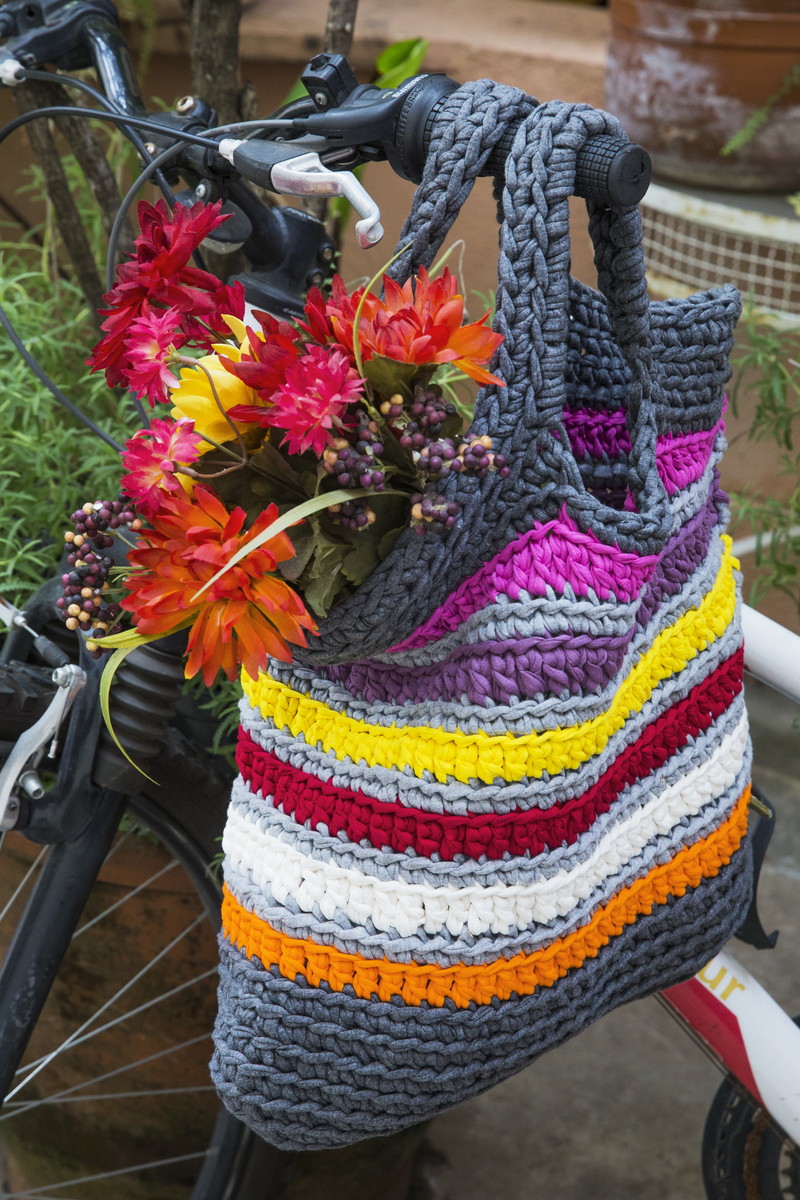 Sacola feira de fio de malha em crochê. É dupla face. Pode ser usada como cesta para organizar brinquedos, toalhas na piscina, revistas e outros objetos da casa.