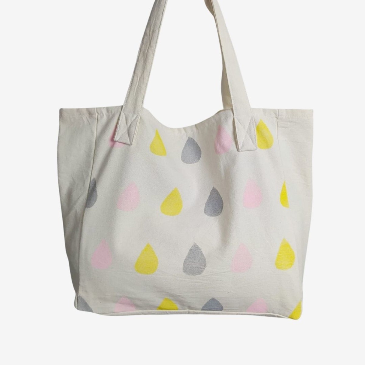 A ecobag é feita em lona rústica 100% algodão na cor crua e estampada com gotas nas cores rosa, cinza e amarelo. Tinta serigráfica à base de água.