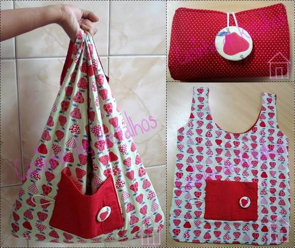 Sacola feita em tecido 100% algodão, bolsinho composê fechamento elático e botão forrado no tecido