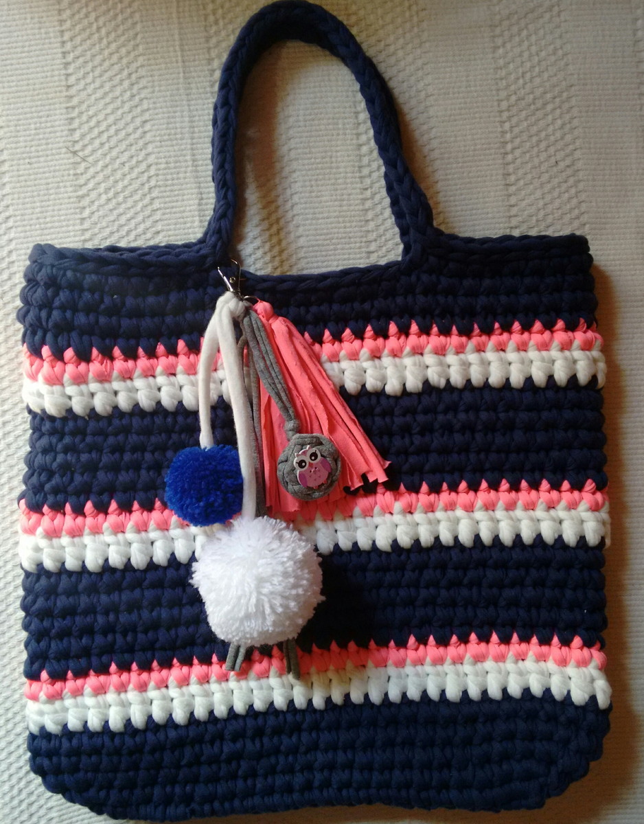Ecobag feita em Crochê com fio de malha, com chaveiro de tassel e pompom, ideal para quem quer um acessório moderno.