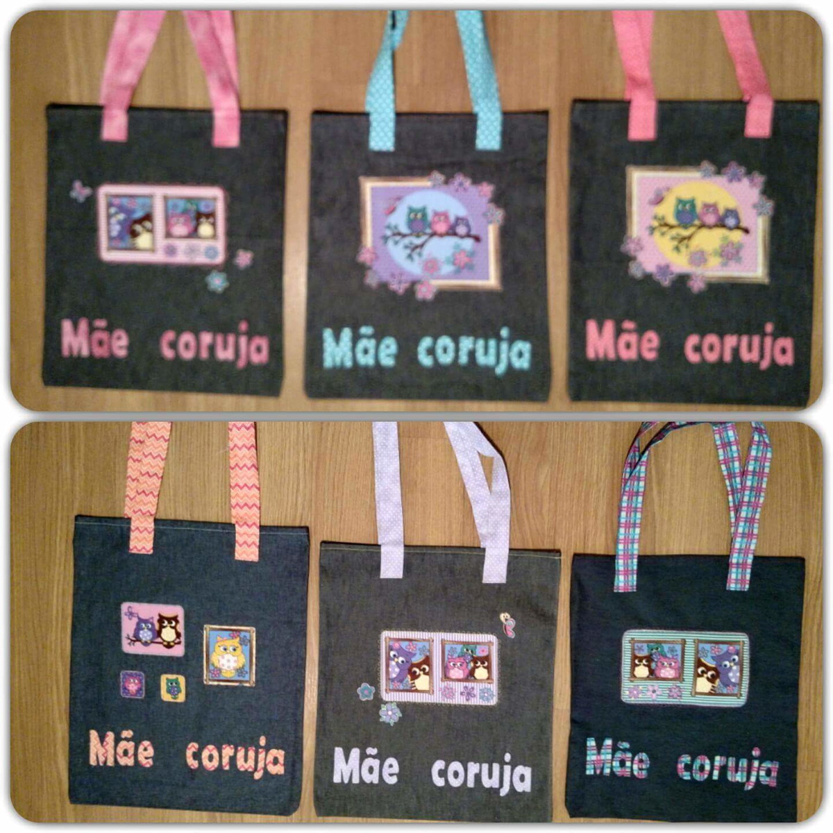 Ecobag jeans com tema "mãe coruja", criada especialmente para datas festivas, podendo abranger avó, tia, dinda, professora coruja... Estampas em tecido 100% algodão combinadas à imagem e ao tema.
