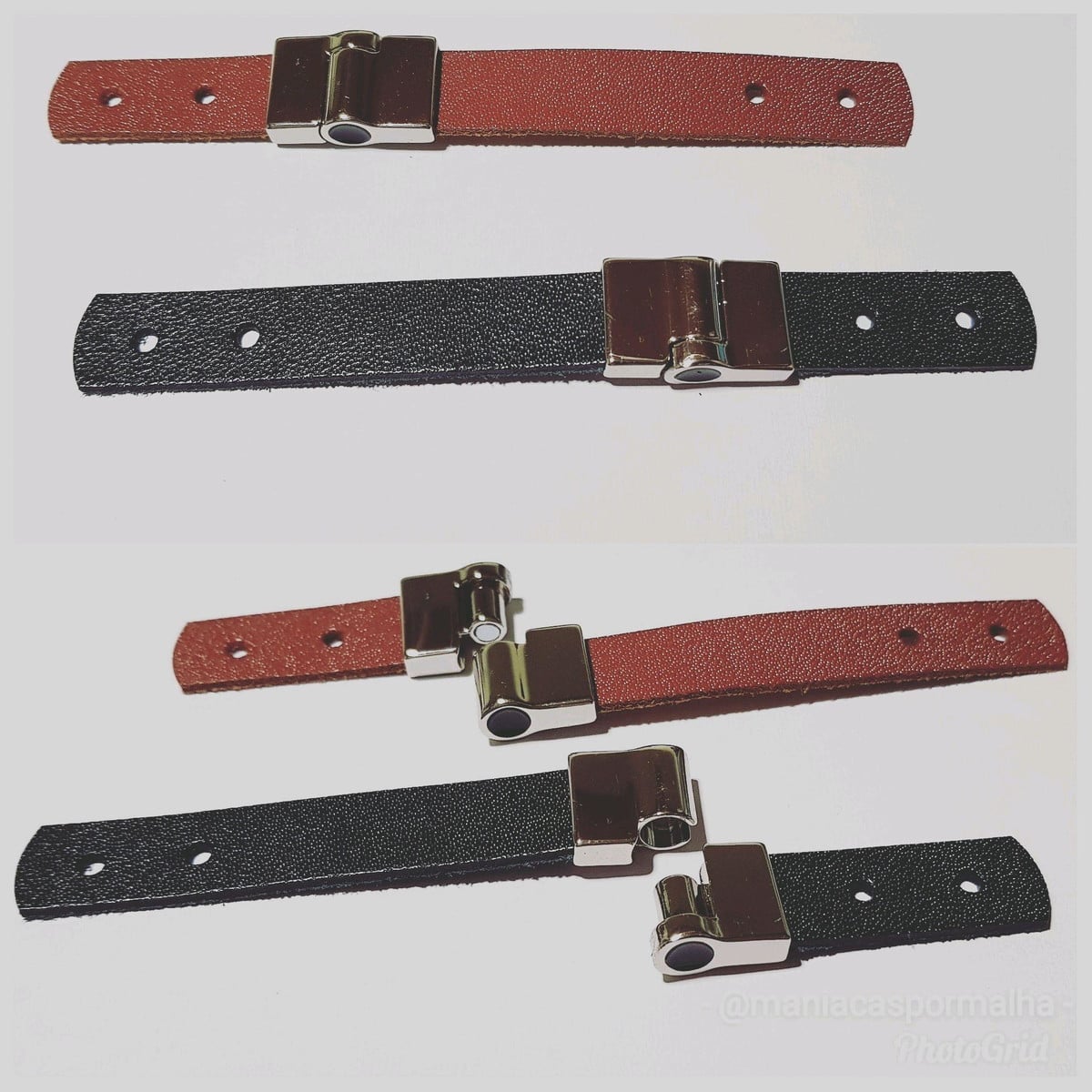 Temos o couro em todas as cores (confirme a cor pelo número antes de concluir a compra) e o fecho na cor prata.