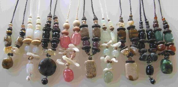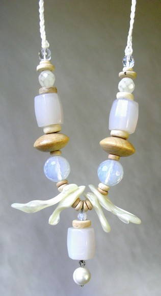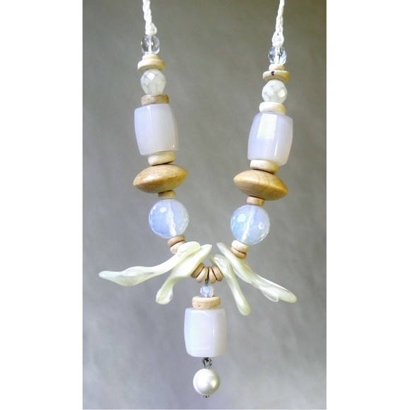 Colar com comprimento ajustável até 50 cm, terminado em fio trançado encerado. Material: Cristal Opalino, Ágata, Madrepérola, Madeira, Pérola, Coquinho Filipino e Cristal Tcheco. R$ 39,60 + Frete.