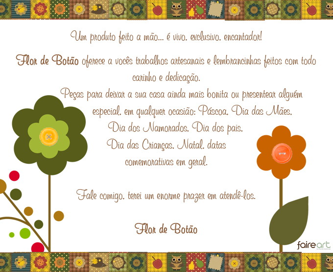 A vendedora e artesã só esclarece dúvidas sobre o produto que confecciona.