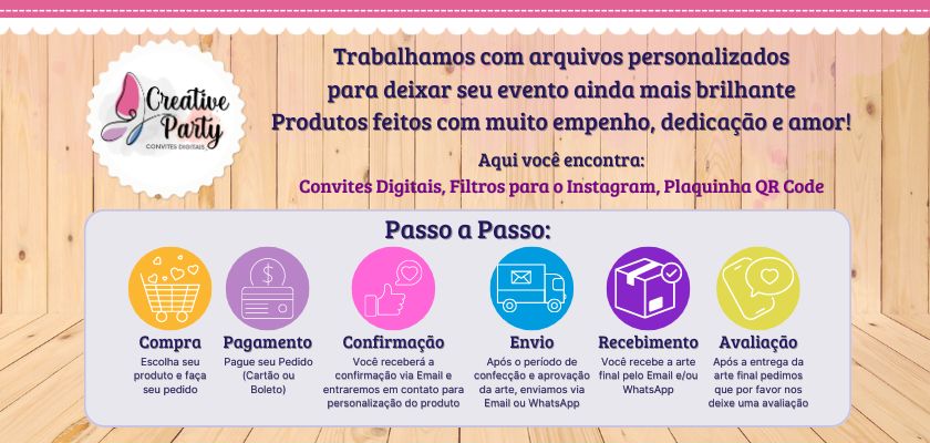 Por favor, não efetuem suas compras sem antes ler nossa Política. Aqui, segue alguns trechos da mesma, porém, é IMPORTANTE que ela seja lida por completo, clicando em POLÍTICAS DA LOJA, ao final deste texto. *IMPORTANTE: Nosso produto não é físico, apenas digital, portanto não enviamos produtos por Correio, nem outro meio, apenas por e-mail. Qualquer dúvida entre em contato pelo chat. *** PREÇOS *** Nos reservamos o direito de alterações de preço nesta Loja. Os valores aqui apresentados podem ser alterados sem aviso. Caso tenha recebido uma encomenda, e optou em pedir mais itens, caso este tenha sofrido alteração no preço, o valor cobrado será o valor vigente em questão. 1. EFETUANDO O PEDIDO Antes de clicar em COMPRAR ESTE PRODUTO ou ENVIAR ESTE PEDIDO À LOJA, confira se o campo de endereço está corretamente preenchido. Caso precise fazer alguma alteração, ela deve ser feita ANTES do pedido ser enviado à Loja. Após, não é possível fazer qualquer alteração no cadastro. 2. PRAZOS Informamos que todas as encomendas possuem o prazo de produção que varia em média 7 úteis, podendo estender-se conforme agenda atual. Consulte-nos para urgências que podemos avaliar um possível encaixe. 4- COMO COMPRAR MAIS DE UM PRODUTO NO MESMO PEDIDO? Em caso de o cliente desejar comprar mais de 1 produto no mesmo carrinho de compra, é só seguir este procedimento: 1-Vá até o produto que deseja comprar, e clique em: "Comprar este produto". 2-Coloque a quantidade desejada em: Quantidade, e clique em Atualizar 3-No lado esquerdo (embaixo) clique em: Escolher mais Produtos 4-Repita o mesmo processo, até escolher todos os itens que deseja 5-Após ter feito isto, clique em: ENVIAR PEDIDO DESTA LOJA. 5- HORÁRIO DE ATENDIMENTO *Nosso horário de atendimento é de segunda a sexta-feira, das 8:00 às 18h. 6- TEM ALGUMA DÚVIDA? Para tirar dúvidas ou solicitar informações, por favor, clique em contatar vendedor e deixe sua mensagem que responderei a todas e tirarei qualquer dúvida. 7 - FORMAS DE PAGAMENTO através do sistema MOIP: - Boleto (a confirmação ocorre em até 72h após o pagamento). - Cartão (confirmação na hora). Os pedidos que não tiverem os pagamentos efetuados em até 3 dias serão automaticamente cancelados.`Para reativar o pedido favor entrar em contato, clicando em contatar o vendedor. Após a arte para aprovação enviada você terá direito a 3 alterações do layout. Para mais alterações, será cobrado o valor de 50% do valor da compra para cada alteração. As alterações aumentaram o prazo de produção. - Após layout aprovado e início da produção o layout não poderá ser alterado. Qualquer dúvida entre em contato conosco. Att.: Gabriela Souza
