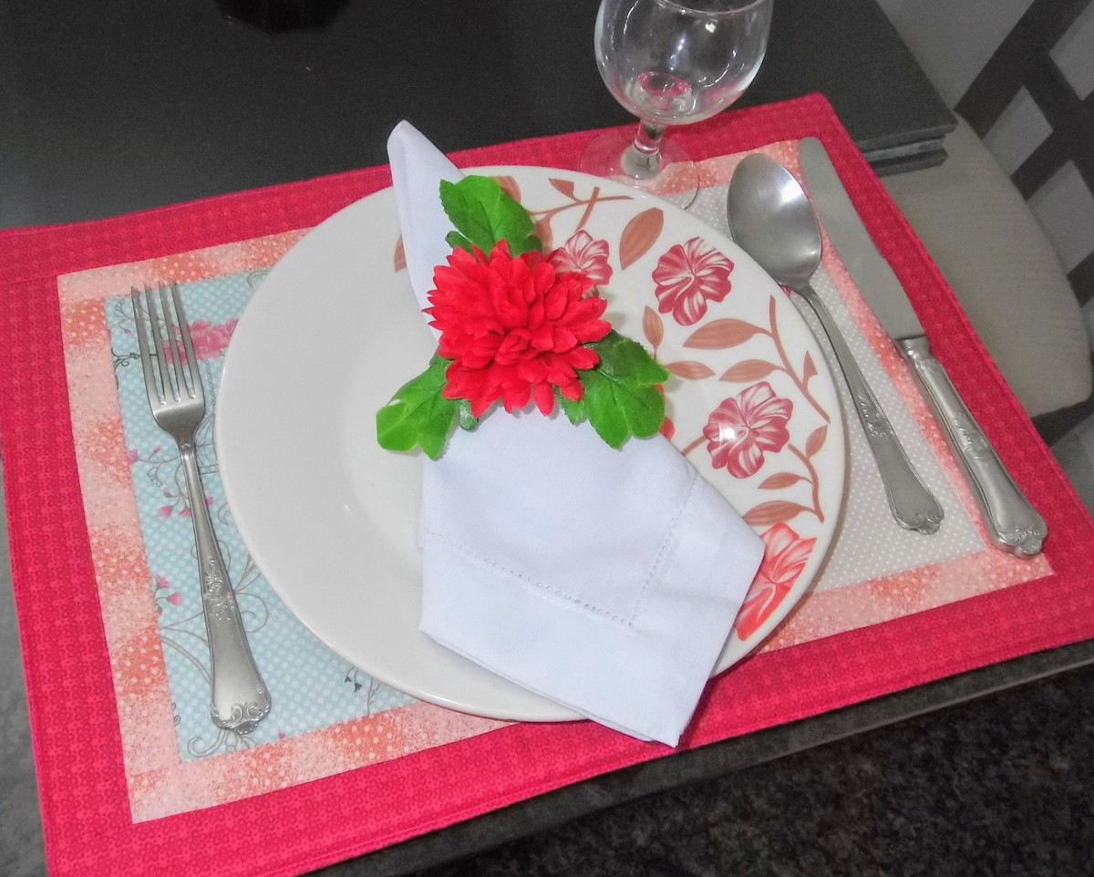Jogo americano em patchwork com detalhe de flor e borboleta bordados. Cor predominante vermelho. Tecido e linha 100% algodão. Aceito encomenda em grande quantidade. Estruturado com manta acrílica. O valor é referente a uma unidade, não acompanha o guardanapo.