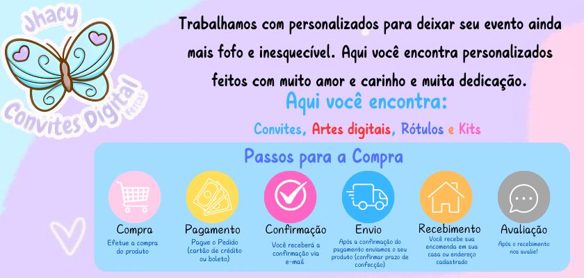 Por Favor, não efetuem suas compras sem antes ler a nossa Política. Aqui, segue alguns trechos da mesma, porém, é IMPORTANTE que ela seja lida por completo, clicando em POLÍTICA DA LOJA, ao final deste texto. *IMPORTANTE; Nosso produto não é físico, apenas digital, portanto não enviaremos produtos por Correio, nem outro meio, apenas por e-mail. Qualquer dúvida entre em contato pelo chat. *** PREÇOS *** Nós reservamos o direito de alterações de preço nesta loja. Os valores aqui apresentados podem ser alterados em aviso prévio. Caso tenha recebido uma encomenda, e optou em pedir mais itens, caso este tenha sofrido alteração no preço, o valor cobrado será o valor vigente em questão. 1. EFETUANDO O PEDIDO Antes de clicar em COMPRAR ESTE PRODUTO ou ENVIAR ESTE PEDIDO Á LOJA,confira se o campo de endereço setá coorretamente preenchido. Caso precise fazer alguma alteração, ela deve ser feita ANTES do pedido ser enviado á loja. Após, não é possível fazer qualquer alteração no cadastro. 2. PRAZOS Informamos que todas as encomendas possuem o prazo de produção que varia em média 7 dias úteis, podendo estender-se conforme agenda atual. Consulte-nos para uegências que podemos avaliar um possivel encaixe. 3. COMO COMPRAR MAIS DE UM PRODUTO NO MESMO PEDIDO? Em caso de o cliente desejar comprar mais de 1 produto no mesmo carrinho de compra, é so seguir este procedimento: 1- Vá até o produto que deseja comprar, e clique em COMPRAR ESTE PRODUTO. 2- Coloque a quantidade desejada em QUANTIDADE, e clique em atualizar 3- No lado esquerdo (embaixo) clique em ESCOLHER MAIS PRODUTOS. 4- Repita o mesmo processo, até escolher todos itens que deseja. 5-Após ter feito isto, clique em ENVIAR PEDIDO DESTA LOJA. 4. HORARIO DE ATENDIMENTO *Nosso horário de atendimento é de segunda á sexta-feira, das 9:00 ás 19:00h. 5. TEM ALGUMA DUVIDA? Para tirar dúvidas ou solicitar informaçãoes, por favor, clique em contatar vendedor e deixe sua mensagem que responderei á todas e tirarei qualquer dúvida. 6.FORMAS DE PAGAMENTO ( atrasvés do sistema MOIP) - Boleto ( a confirmação ocorre em até 72hs após o pagamento). - Cartão ( confirmação na hora). Os pedidos que não tiverem os pagamentos efetuados em até 3 dias serão automaticamente cancelados. Para reativar o pedido favor entrar em contato, clique em contatar o vendedor. Após a arte para aprovação enviada você terá direito a 3 alterações do layout. Para mais alterações, será cobrado o valor de 50% do valor da compra para cada alteração. As alterações aumentaram o prazo de produção. - Após layout aprovado e inicio da produção o layout não poderá ser alterado. Qualquer dúvida entre em contato conosco. Att: Jhacy Silva