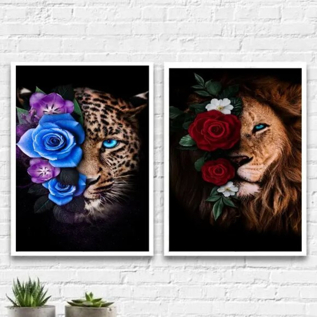 Kit 2 Quadros Onça e Leão com Flores (a3 -com Vidro)