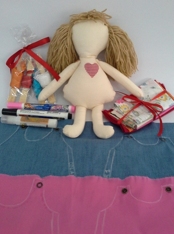 Kit composto por um boneca em tecido, cabelo de lã e rosto em branco, dois moldes de vestido riscados em tecido, com botões já instalados para facilitar o fechamento, quatro opções de aplicações entre fitas, rendas e/ou sianinhas, duas canetas de tecido e uma cola para pano.