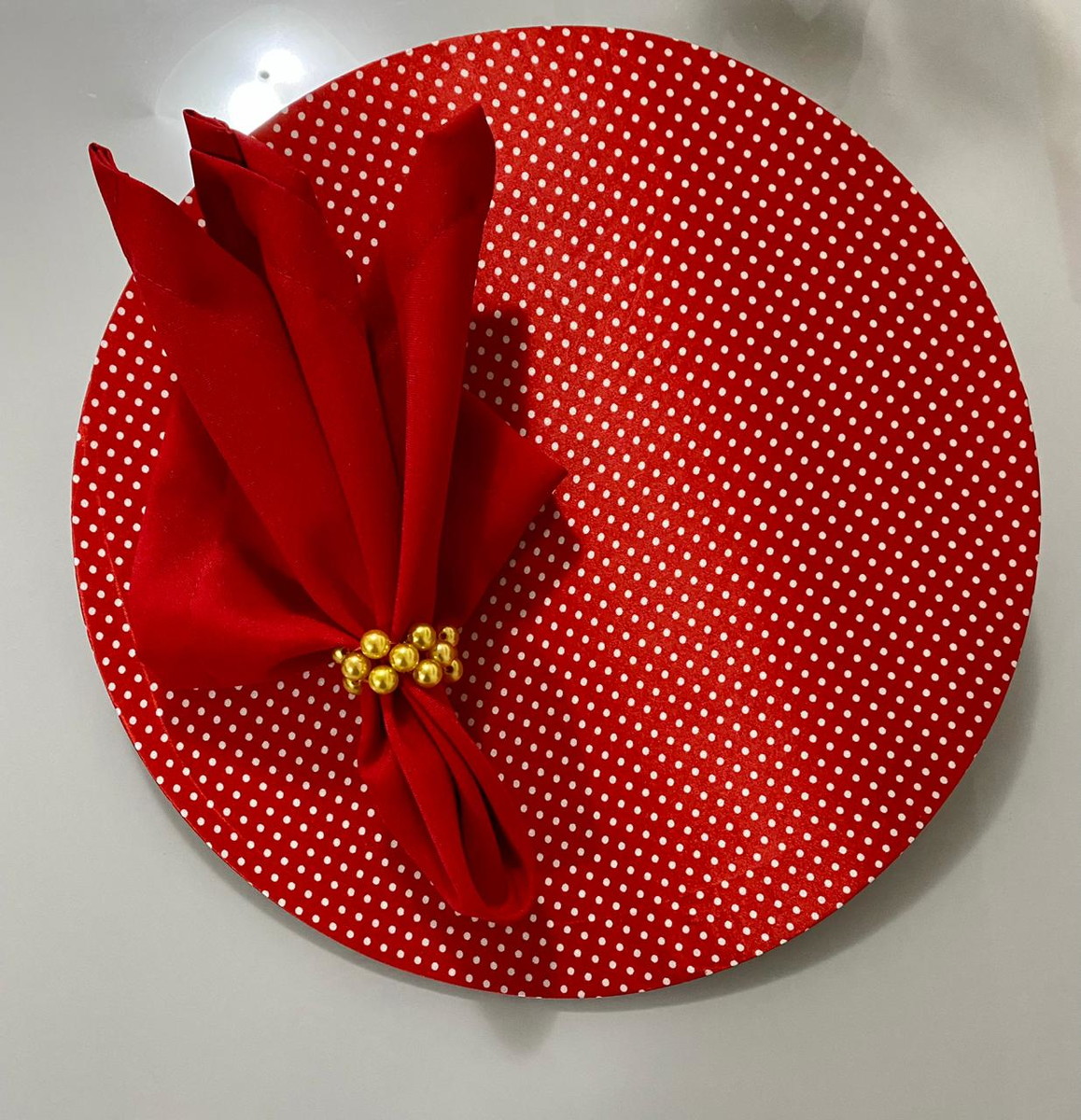 Kit com 2 lindas capa de sousplat em tecido acetinado na cor vermelha com estampa de poá branco.