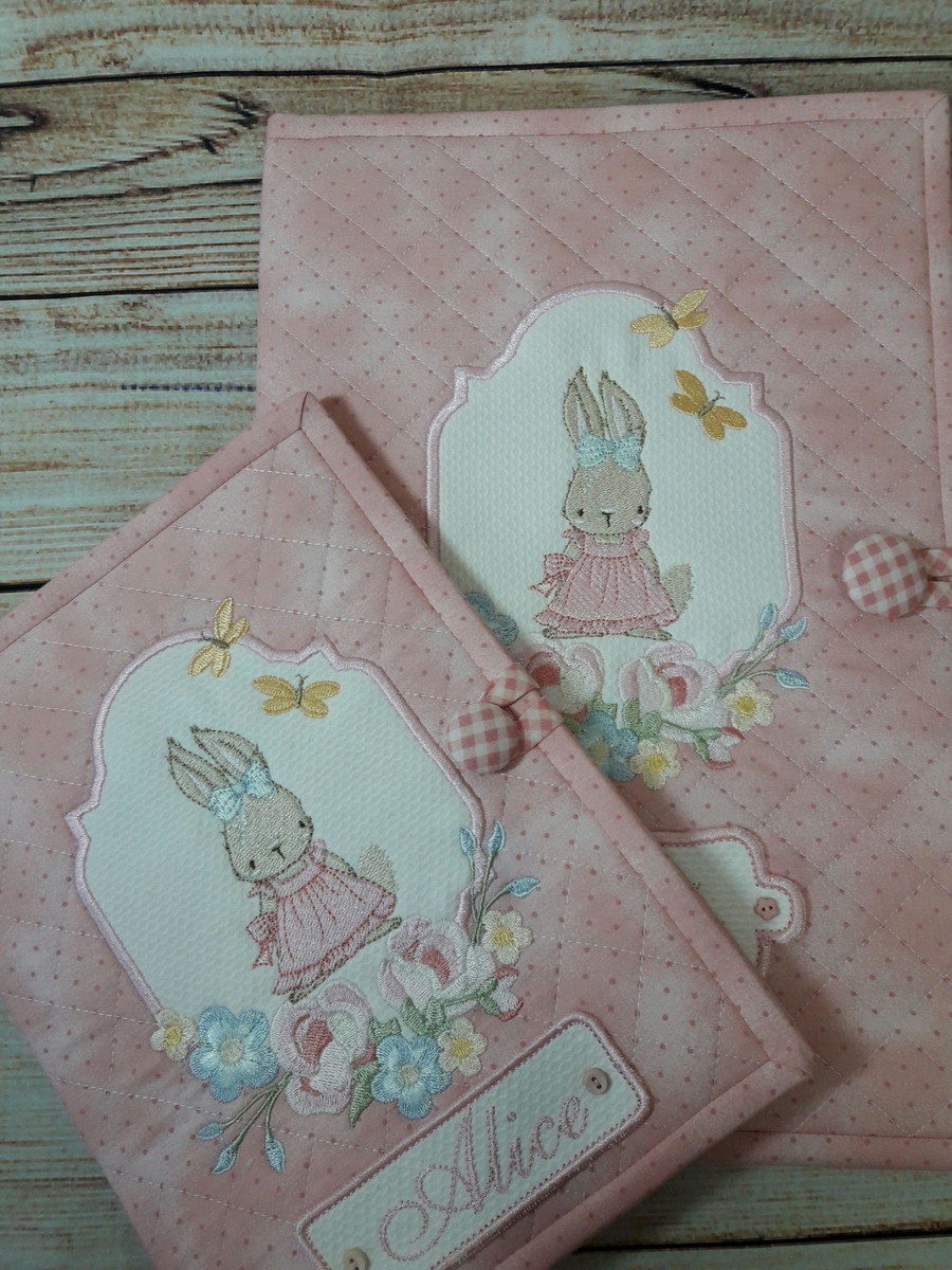 kit contendo porta cartão de vacinas medindo 17 cm de largura ( fechado ) e 24 com de altura e porta documentos medindo 36 cm de largura ( fechado) x 25 cm de altura. Comporta uma folha A4 sem dobrar. Ambas peças contêm 4 bolsos internos sendo 2 de tecido e 2 de tela com zíper. Outros temas podem ser bordados.Consulte
