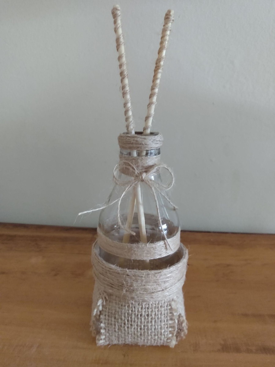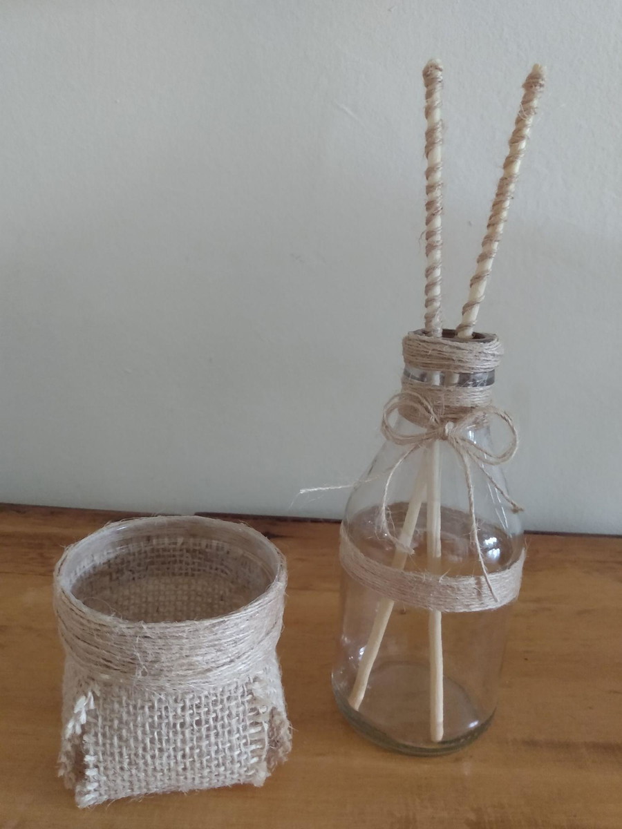 Garrafinha de vidro com cachepô plástico decorada com juta e varetas difusor