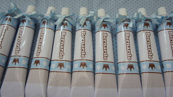 Kit com 20 potinhos e 20 bisnaguinhas recheados com brigadeiro e personalizados
