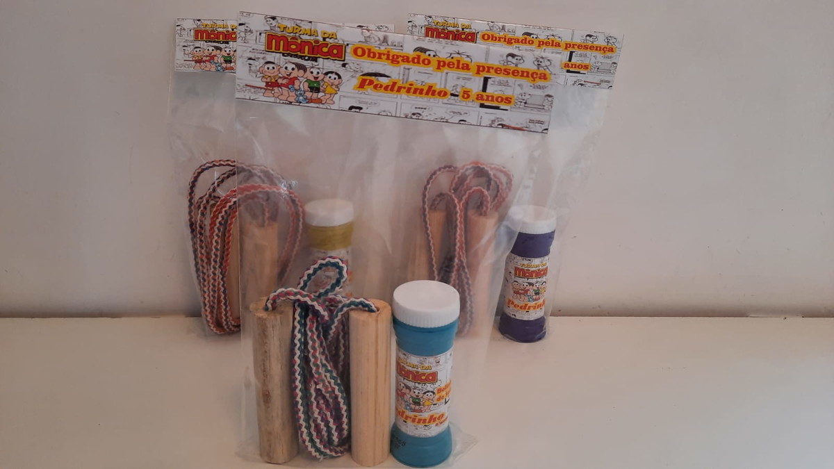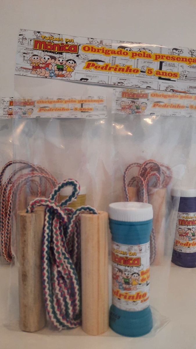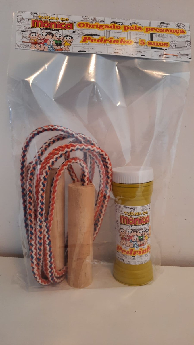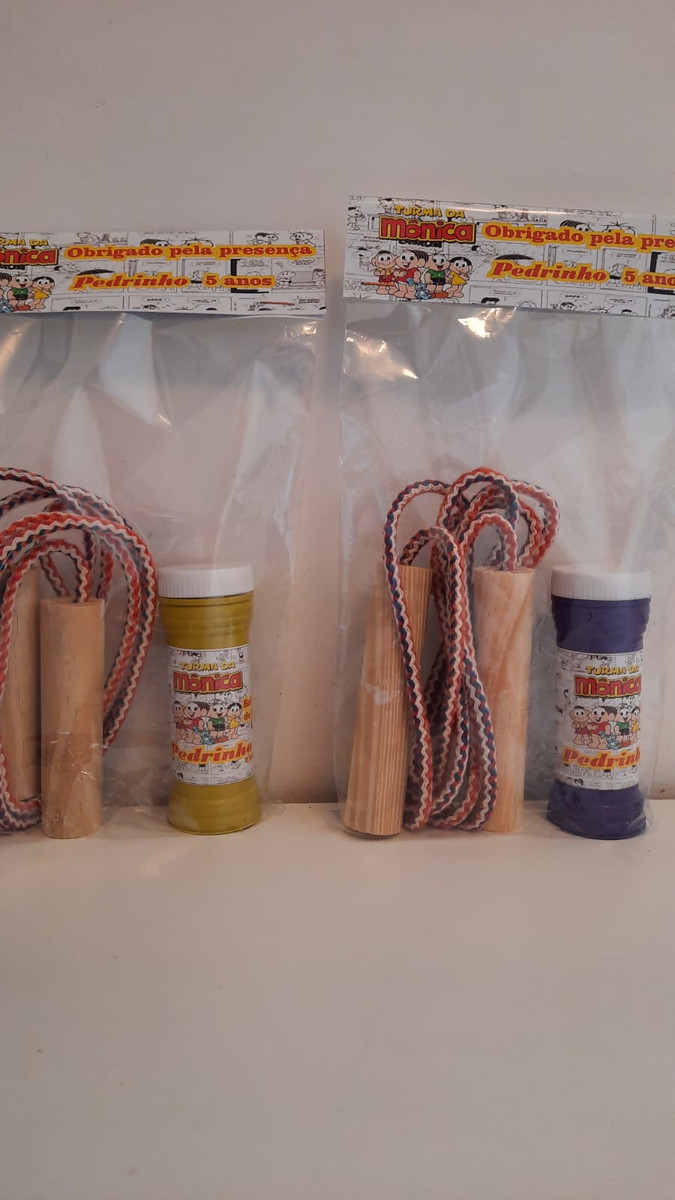 kit pula corda com bolinha de sabão a bolinha vai com adesivo no tema da festa e a lapela que fecha o saco também