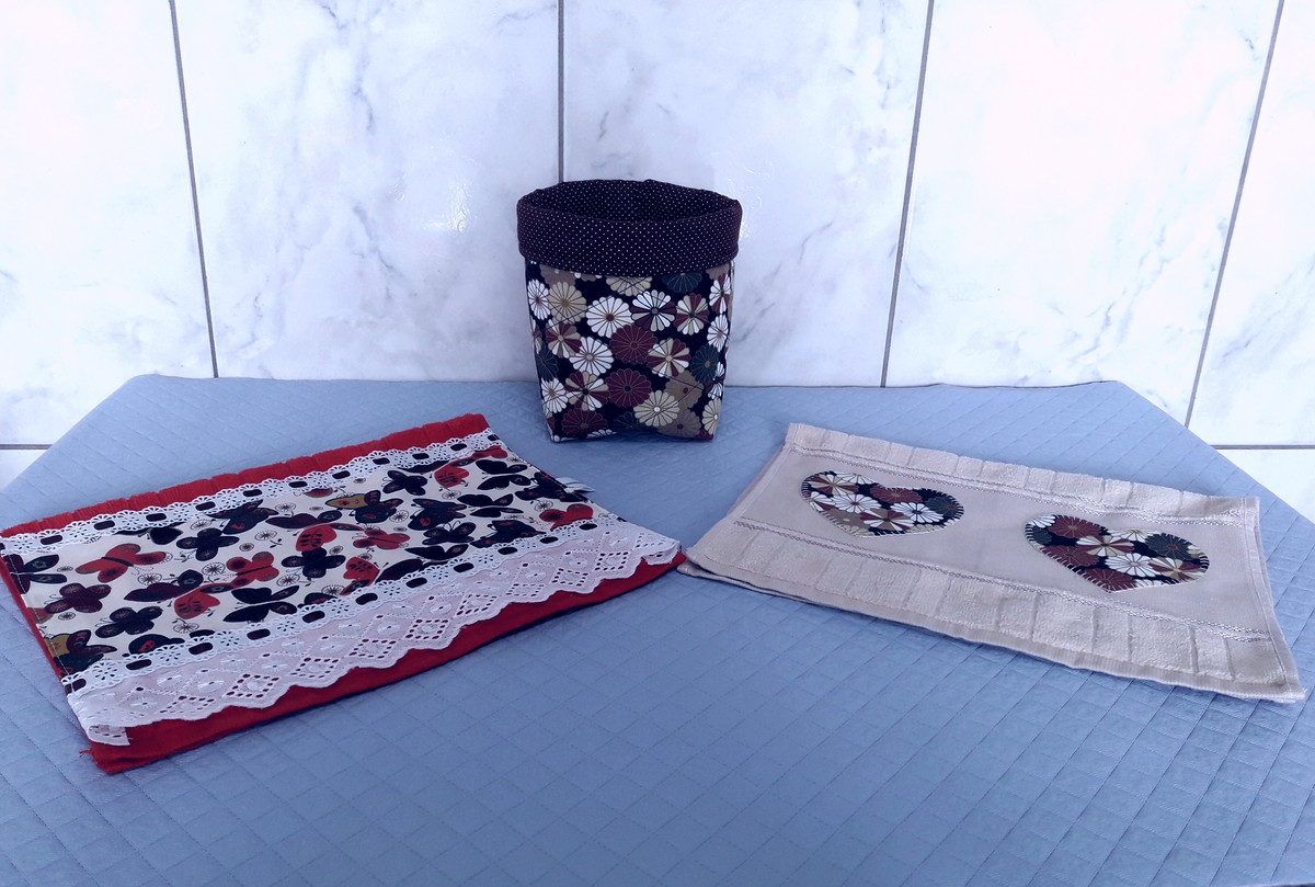 Ki Cachepo confeccionado em tricoline 100% algodão, manta acrílica R1. Acompanha duas toalhas para lavabo com aplicações.
