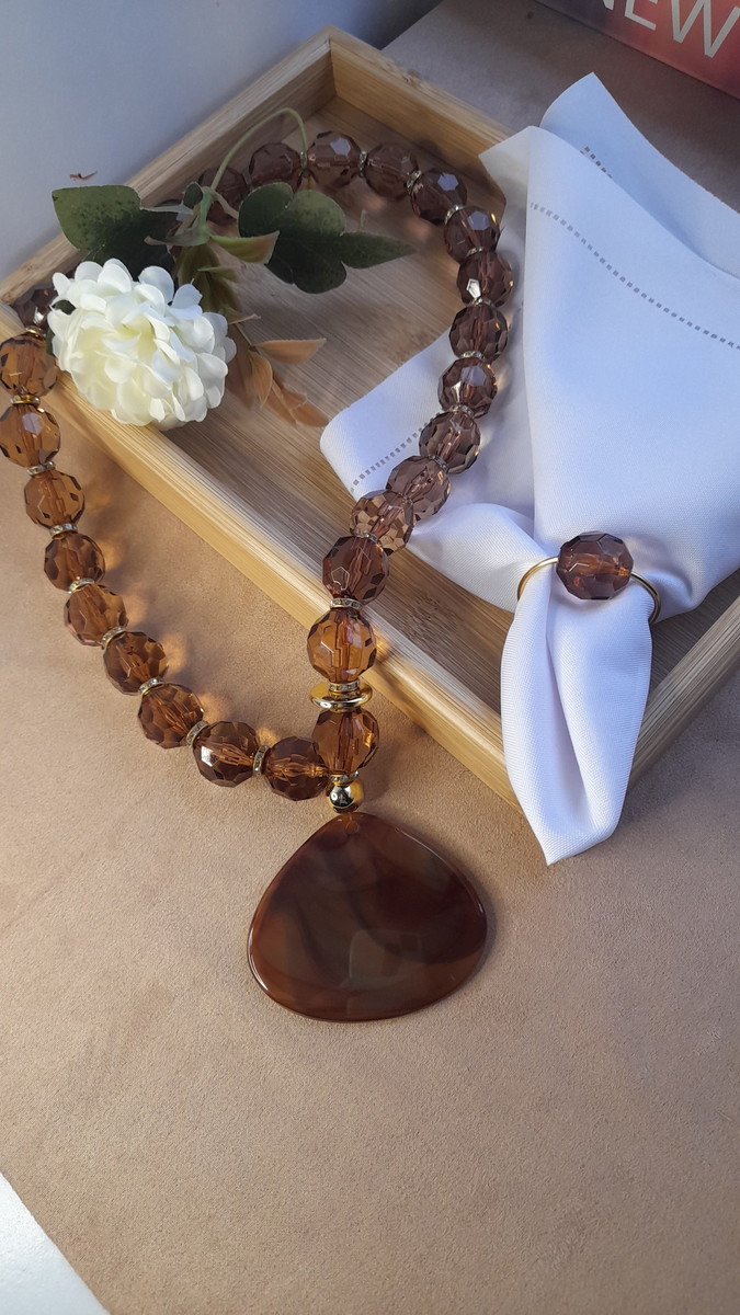 O colar de mesa com contas facetadas em tom âmbar traz um toque acolhedor e sofisticado, enquanto o porta-guardanapo com detalhe em cristal complementa a composição com harmonia e elegância.