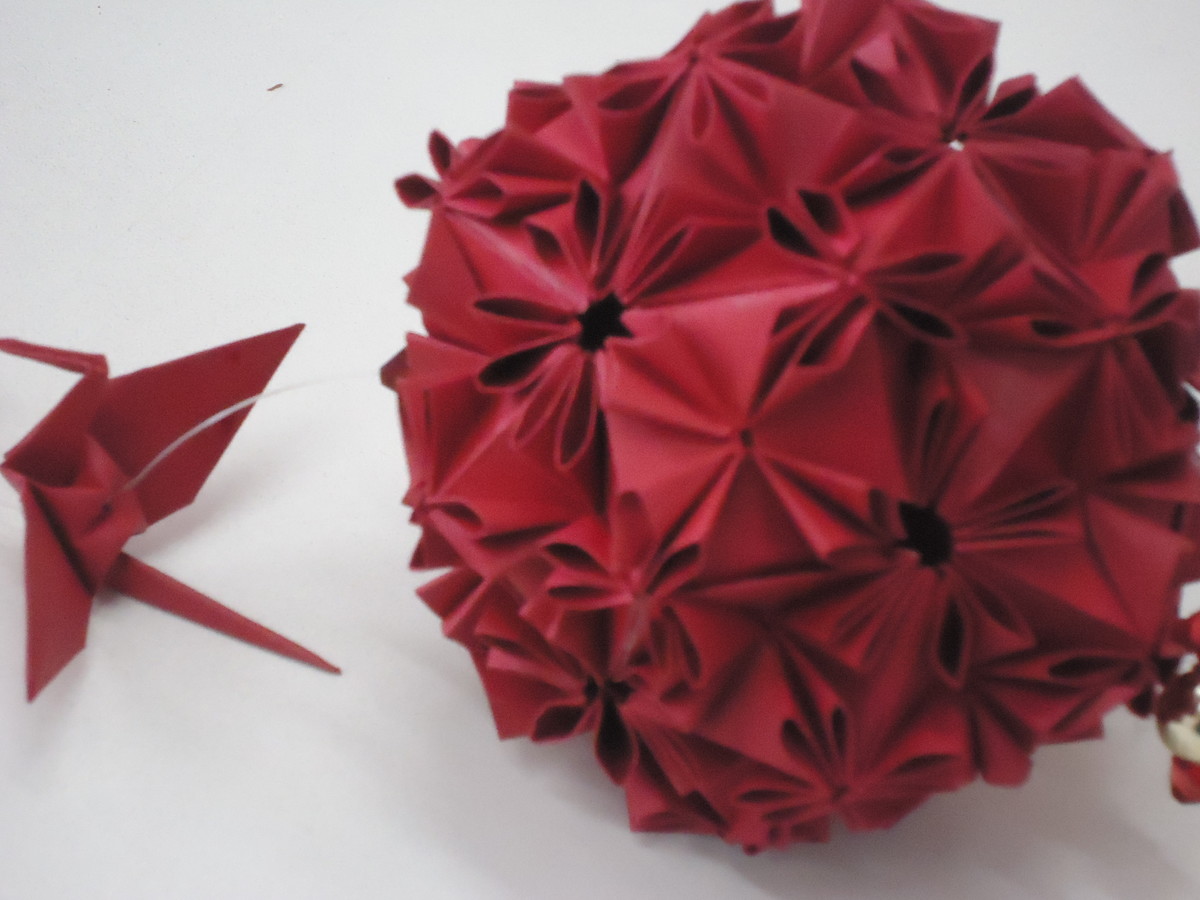 Kusudama Loop 30 módulos, feita em papel color Plus e decorada com miçangas vermelhas e douradas e Tsurus. Linda peça de decoração.