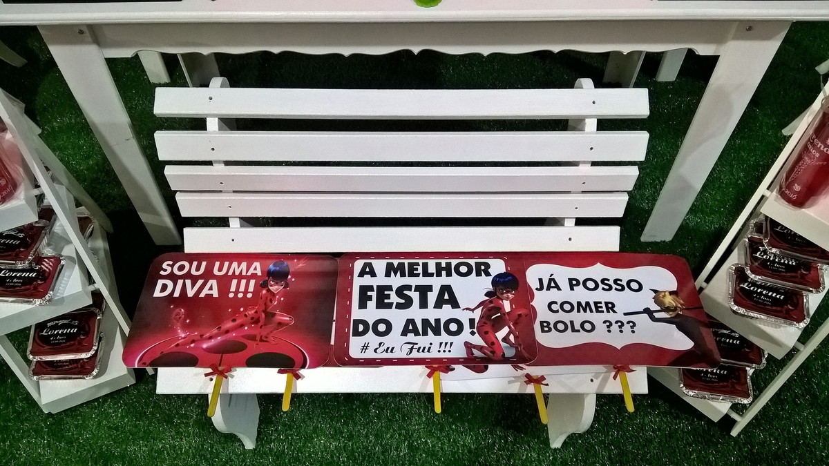 Decoração provençal completa; painel com banner e bexigas e plaquinhas para as fotos
