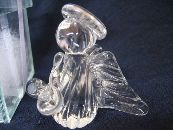 Lembrança Anjo de cristal com mini terço. Embalado em saquinho de organza com renda, laço duplo de cetim e mini cartãozinho de agradecimento com nome e data.