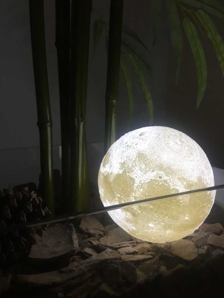 A base da lua foi projetada pela nossa equipe de designers e conseguimos desenvolver um produto que se adéqua a proposta da luminária, uma peça bonita e sofisticada, com um encaixe para esconder o cabo de energia, dessa maneira damos o maior destaque a parte mais importante de todo o conjunto, lógico, a LUA!