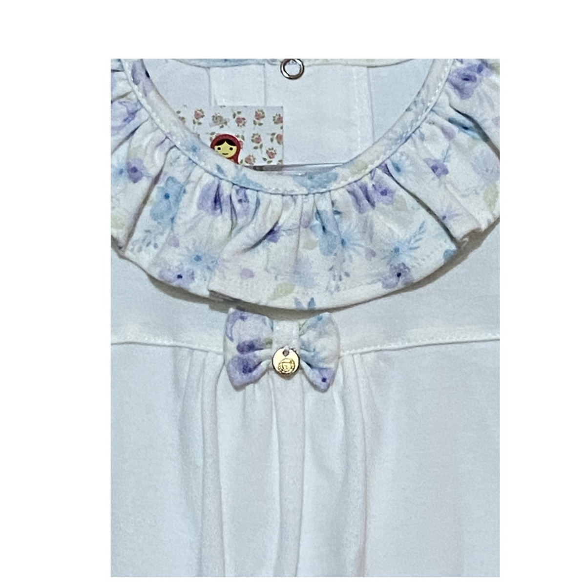 -Macacão na cor bege clarinho, com uma gola com babado estampado floral, com