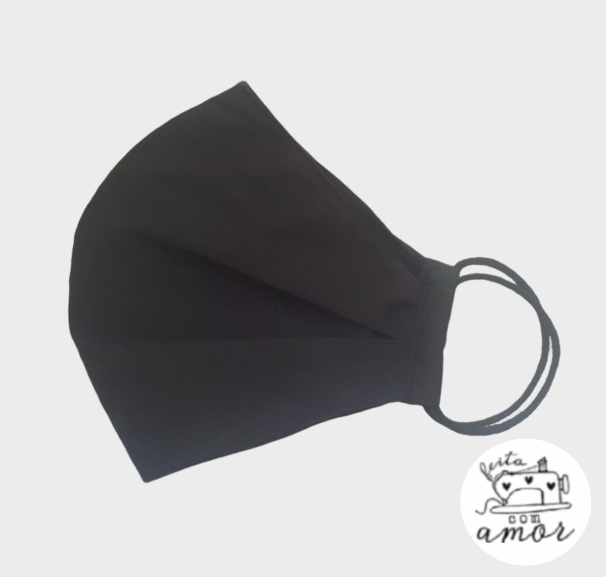 Máscara com pregas e elástico ajustável em tecido com dupla camada de proteção.