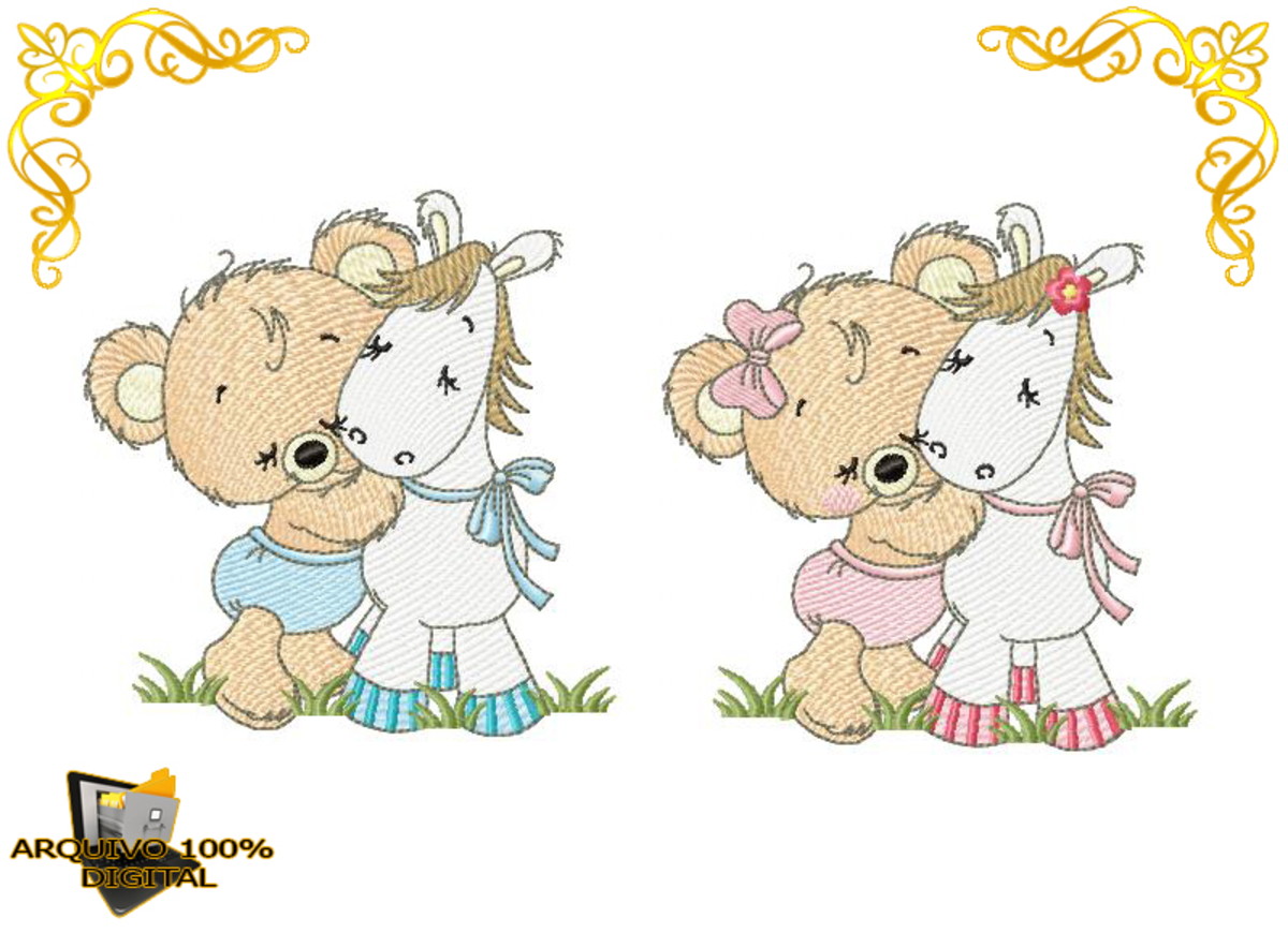 Matriz Bordado com Ursinha e Ursinho com Cavalinho