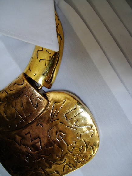 Todo em metal com banho ouro velho e detalhe em arte rupestre. Para Mocinhas de personalidade marcante e ousada.