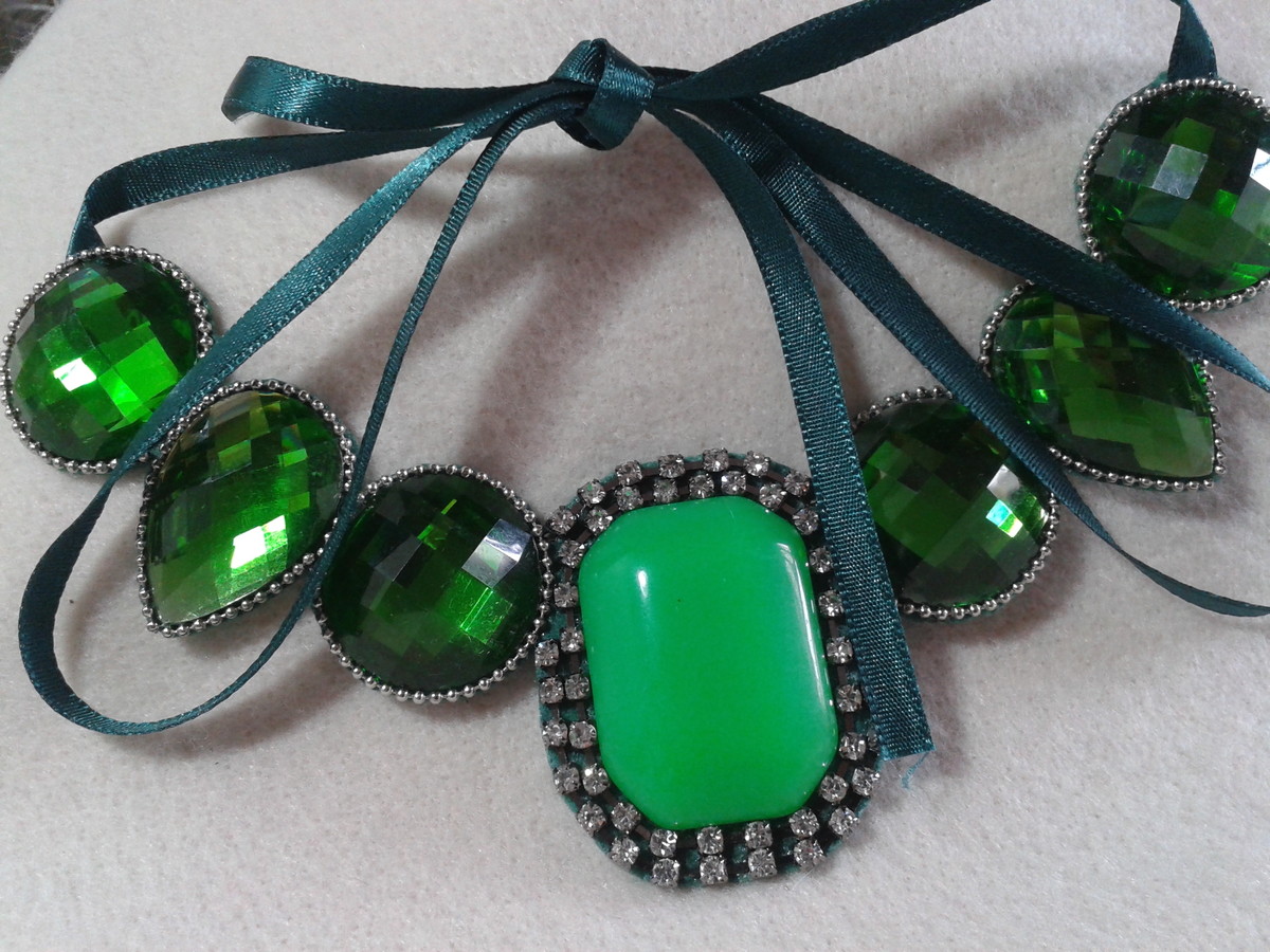 MAXI COLAR VERDE COM BASE EM FELTRO, CHATONS EM ACRILICO E STRASS.