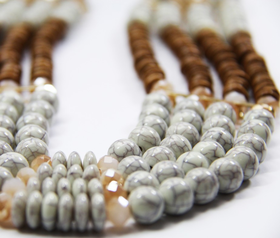 Colar em forma de tranças com várias linhas de miçangas na cor dourada. Feixo regulável.