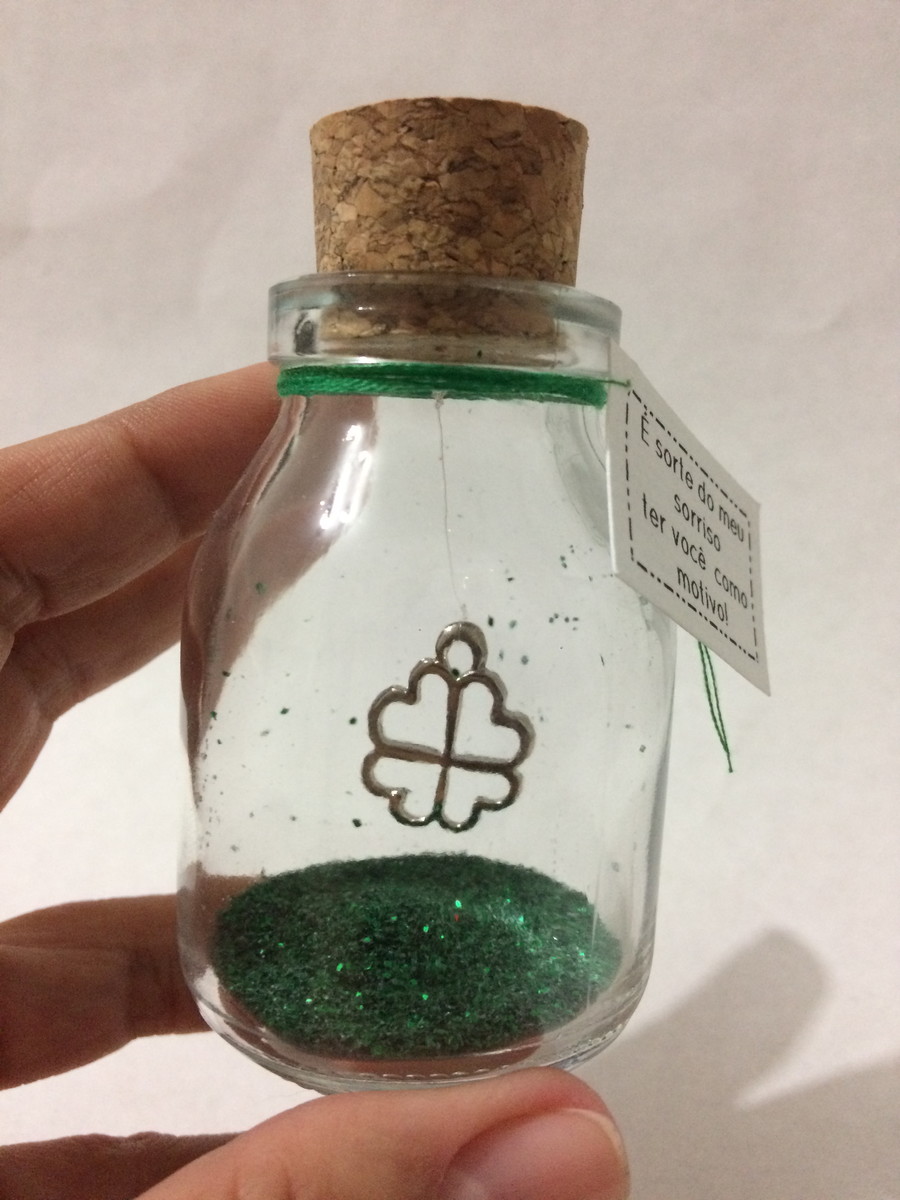 Mini pote de vidro 8,5 x 4,5 cm com decoração interna e frase "É sorte do meu sorriso ter você como motivo!" .