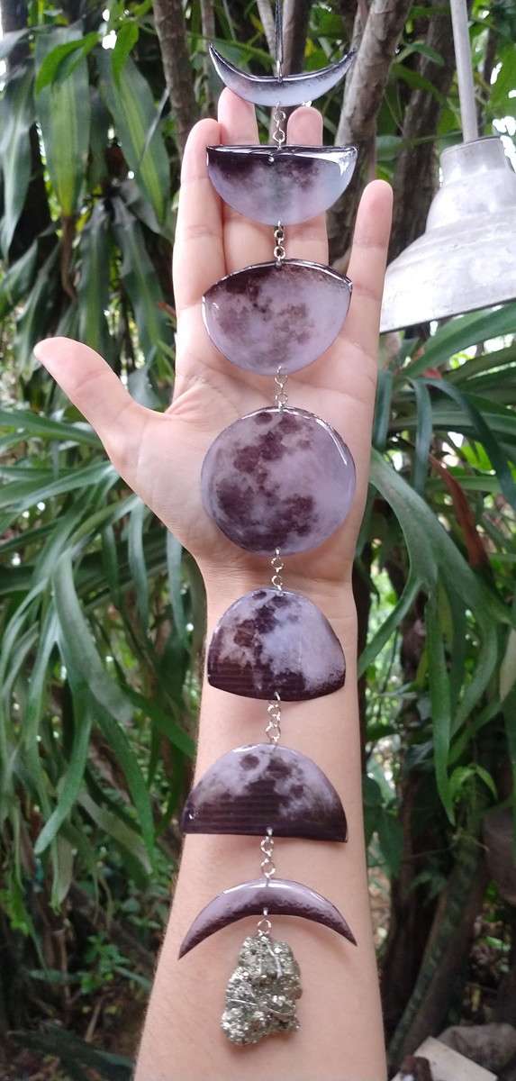 Móbile artesanal, em resina, metais em aço inox. Estampa fases da lua. Pingente pedra natural pirita.