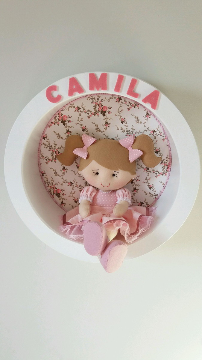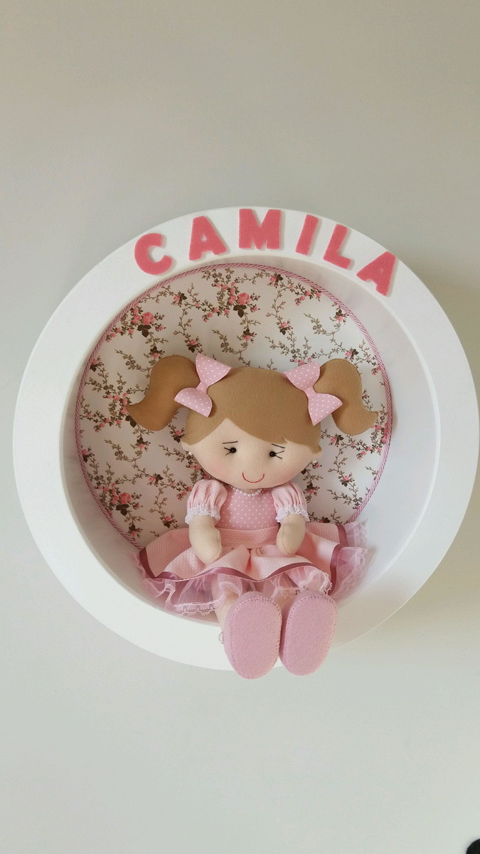 Boneca confeccionada em feltro mede 20 cm sentada.