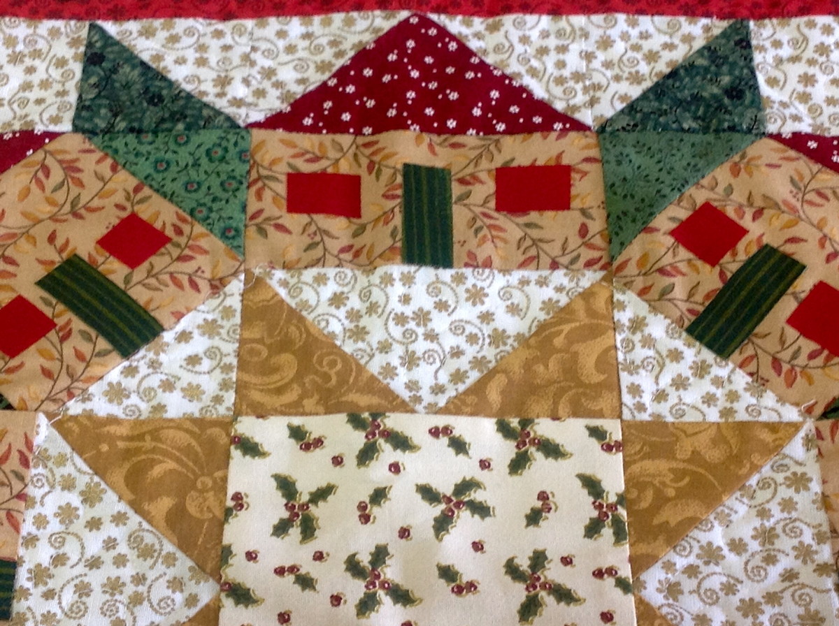 Painel decorativo feito em patchwork clássico com motivo de Natal em formato de guirlanda de casinhas, confeccionado em tecidos nacionais e quilt livre.