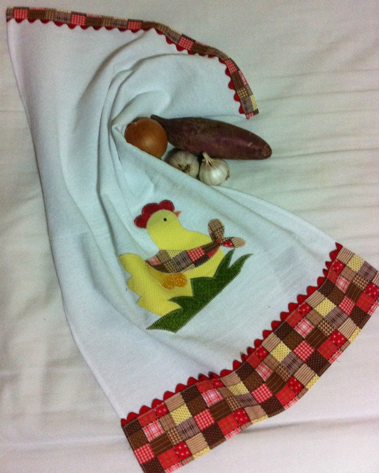 Panos de prato em patchwork com desenho de galinhas e barrado em tecido.