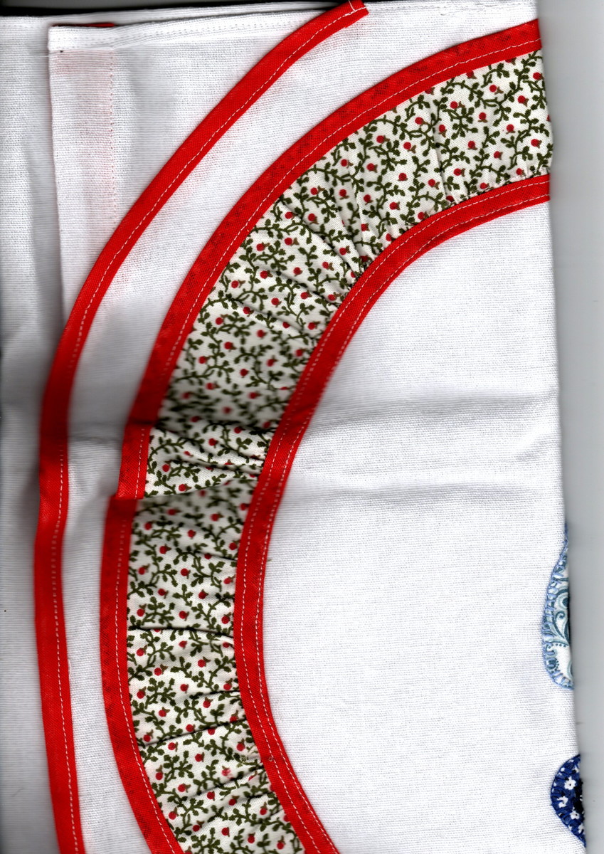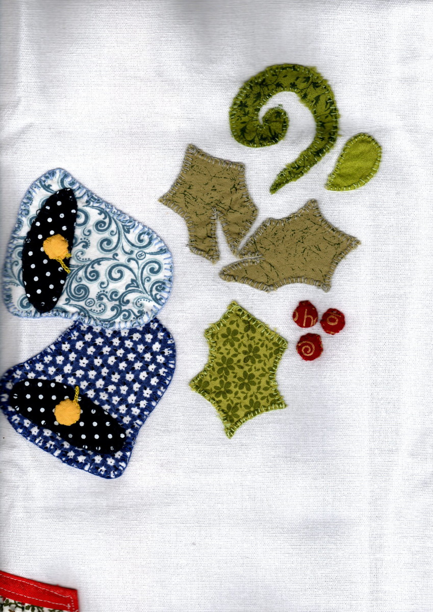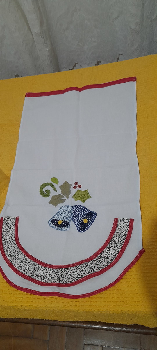 Aplicação central com tema natalino: sinos em tecido estampado, folhas de azevinho e
