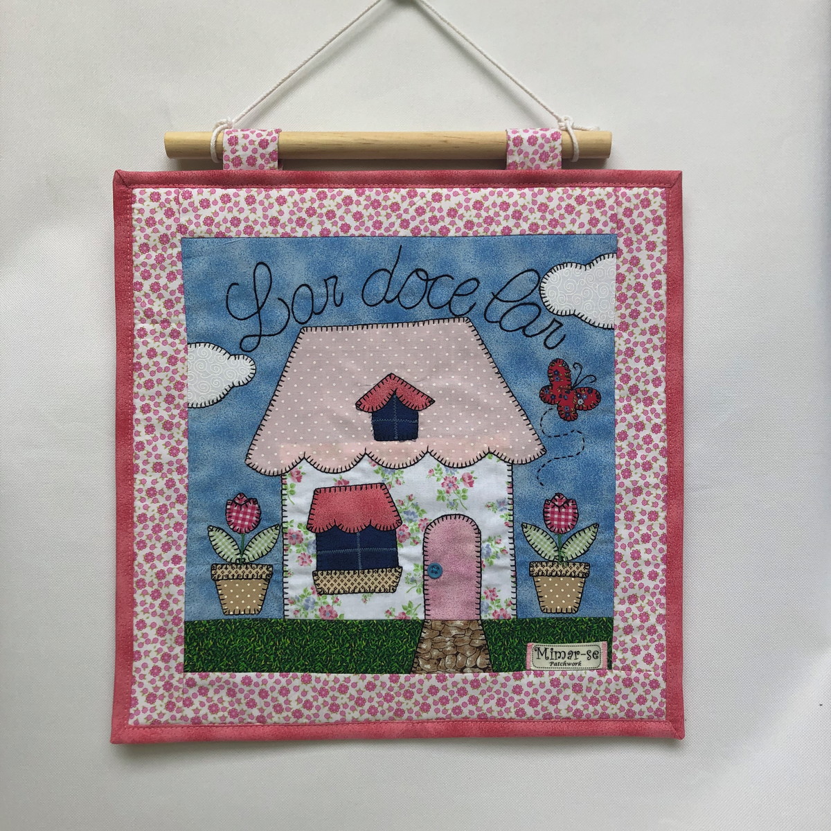 Panô em patchwork, quiltado, confeccionado em tricoline 100% algodão, estruturado com manta R2, aplicações em tricoline, bordado a mão.