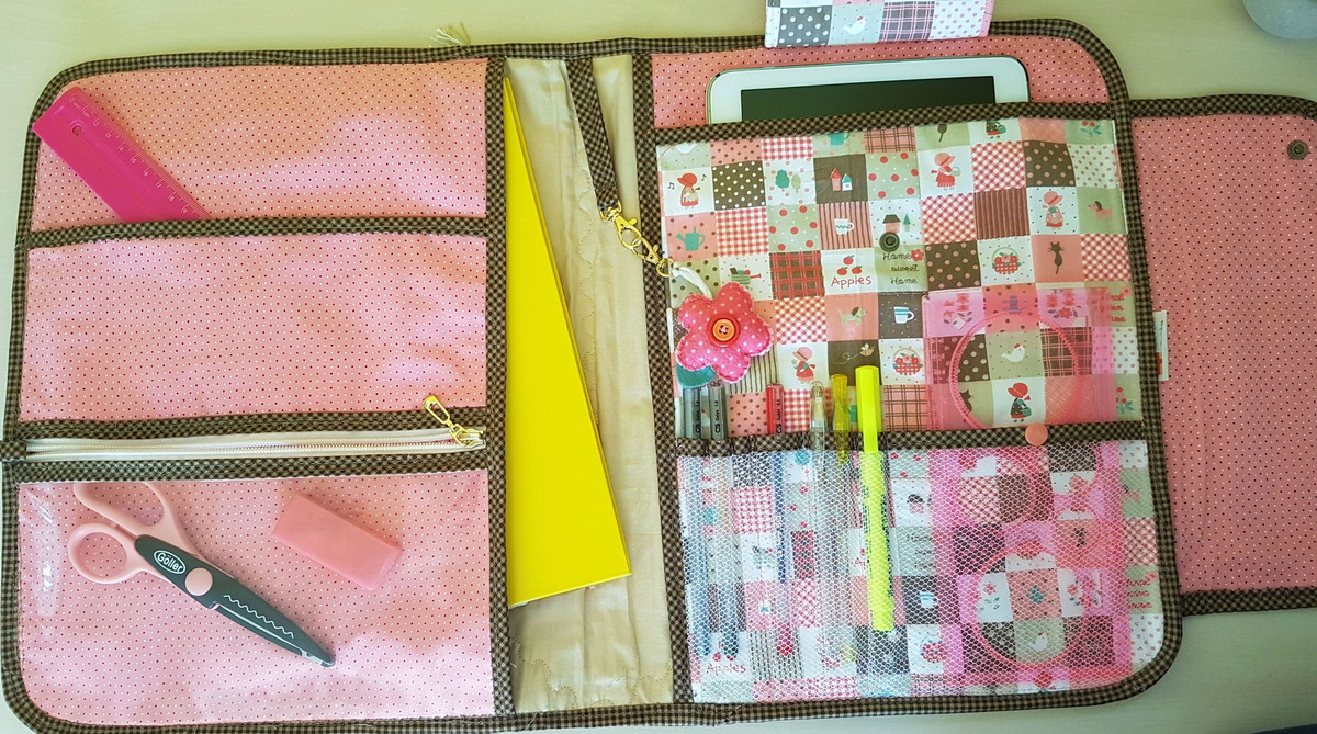 Porta canetas e bolso para acessórios.