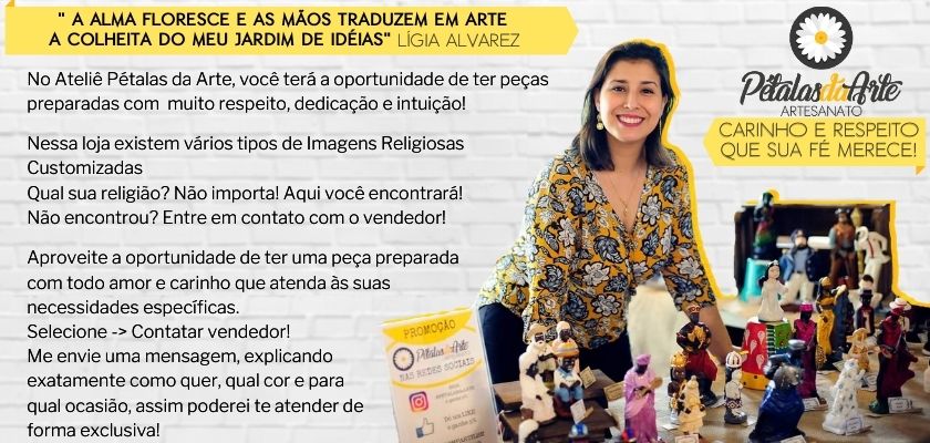 Informações Importantes: Os dias úteis mencionado no anúncio para confecção das peças NÃO INCLUI, sábados, domingos e feriados! A contagem do prazo de produção e/ou envio inicia-se APÓS a confirmação de pagamento e liberação do site. Portanto, realizando a compra das imagens feitas por encomenda, você está ciente que em caso de desistência, haverá um reembolso PARCIAL, pois houve início de trabalho e gastos com matéria prima e mão de obra. Assim que o envio for realizado, o código de rastreamento será disponibilizado. Garanta que no local informado tenha sempre alguma pessoa disponível para receber a mercadoria! Garantimos que nossos produtos vão devidamente embalados (envoltos em plástico bolha, muito jornal e papelão), de forma a impedir choques e atritos durante o transporte entre os objetos ou entre as paredes da caixa, porém, alguns contratempos podem acontecer na própria empresa de entrega, o que NÃO É de responsabilidade do vendedor, pois é um serviço terceirizado e da escolha do cliente. Assim que receber seu produto, orientamos que verifique se a embalagem está intacta, caso venha a ocorrer alguma das situações abaixo, o cliente deverá RECUSAR o recebimento do produto: Embalagem aberta ou avariada (quebrada, rasgada, molhada, amassada); Produto avariado; Produto em desacordo com o pedido. Buscamos através das fotos dos produtos reproduzir com a maior fidelidade possível as suas cores reais. No entanto, pode haver distorções nas tonalidades por ser um produto artesanal e/ou por diferença de configuração de exibição da sua tela. Pedimos encarecidamente que não ocorra distribuição indevida da imagem sem a devida autorização da artesã. Em caso de compartilhamento nas redes sociais, é liberada contanto que não se esqueça da autoria! Basta utilizar a tag #petalasdaarte Entregamos para todo o Brasil! - Sinalizar caso seja presente, pois temos a opção de enviar com mensagem personalizada! Agradecemos pela confiança e pelas indicações, graças a vocês estamos há 7 anos no mercado, fazendo arte e homenageando o sagrado! Att. Pétalas da Arte