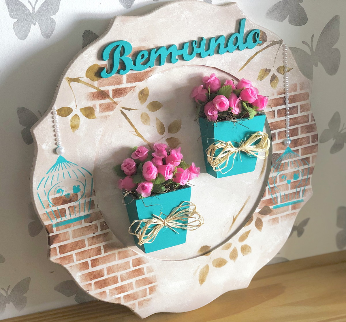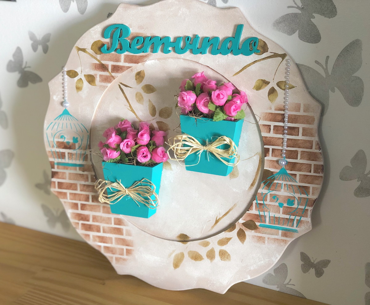 Com apliques de pérolas, palavra Bem-vindo e vasinhos em mdf pintados com arranjinhos de mini rosas.