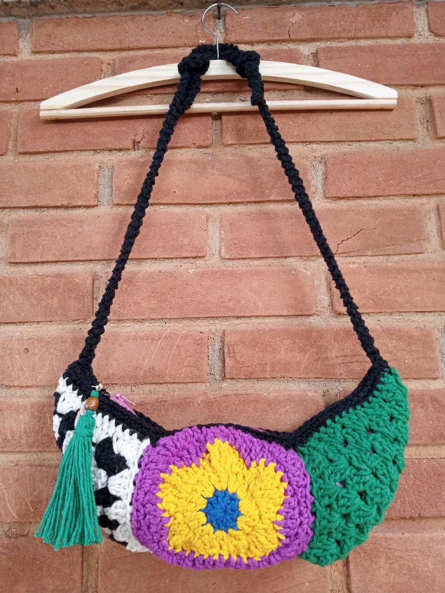 Uma Pochete com um desenho lindo que mais parece um Patchwork, confeccionada a mão em crochê, é aquele acessório que leva tudo o que você precisa sem perder o estilo e a originalidade!