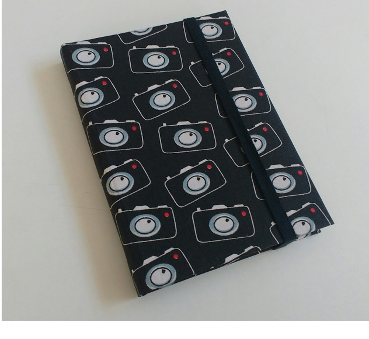 Porta passaporte e documentos em cartonagem, revestido com tecidos e fechamento e acabamento com ilhoses e elástico.