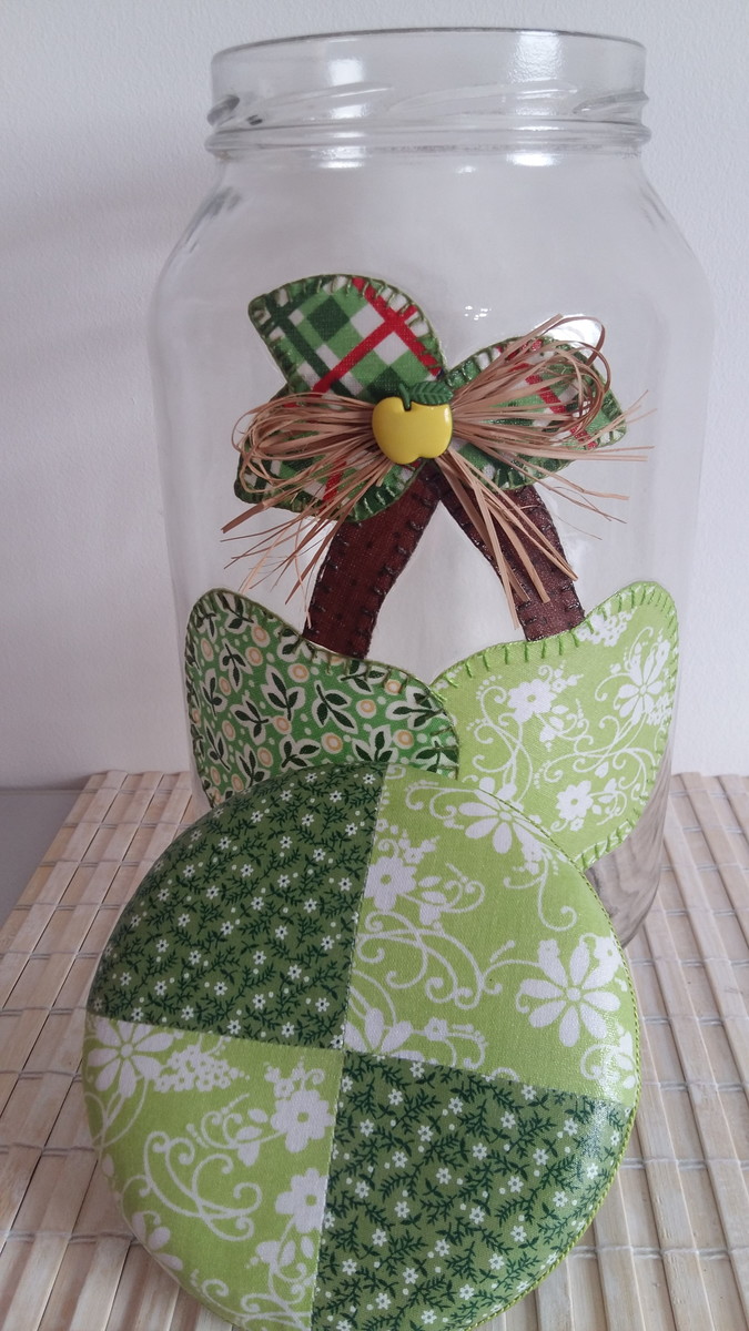 Pote de vidro com decoupage de tecido e, tampa forrada com tecido.