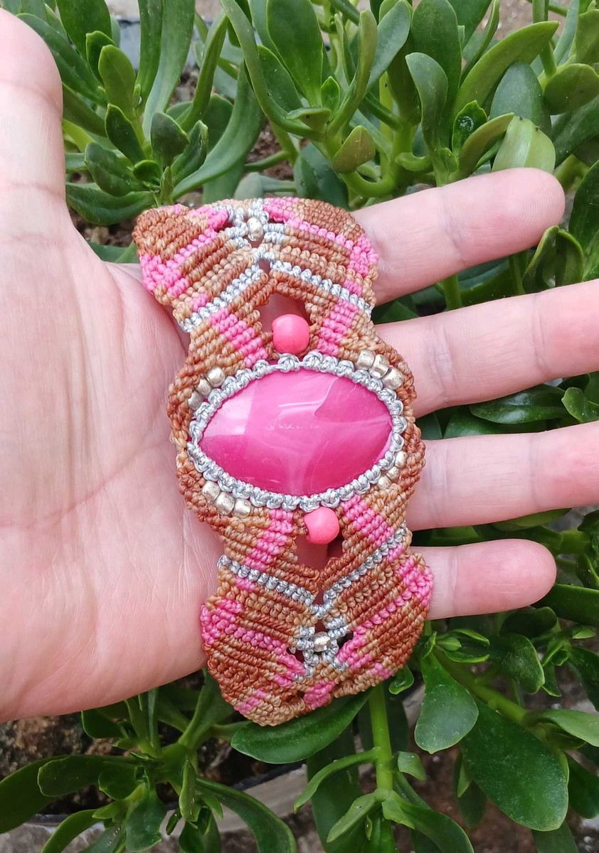 Confeccionada em fio encerado rosa, Bege e prata com miçangas prata e pedra de resina rosa